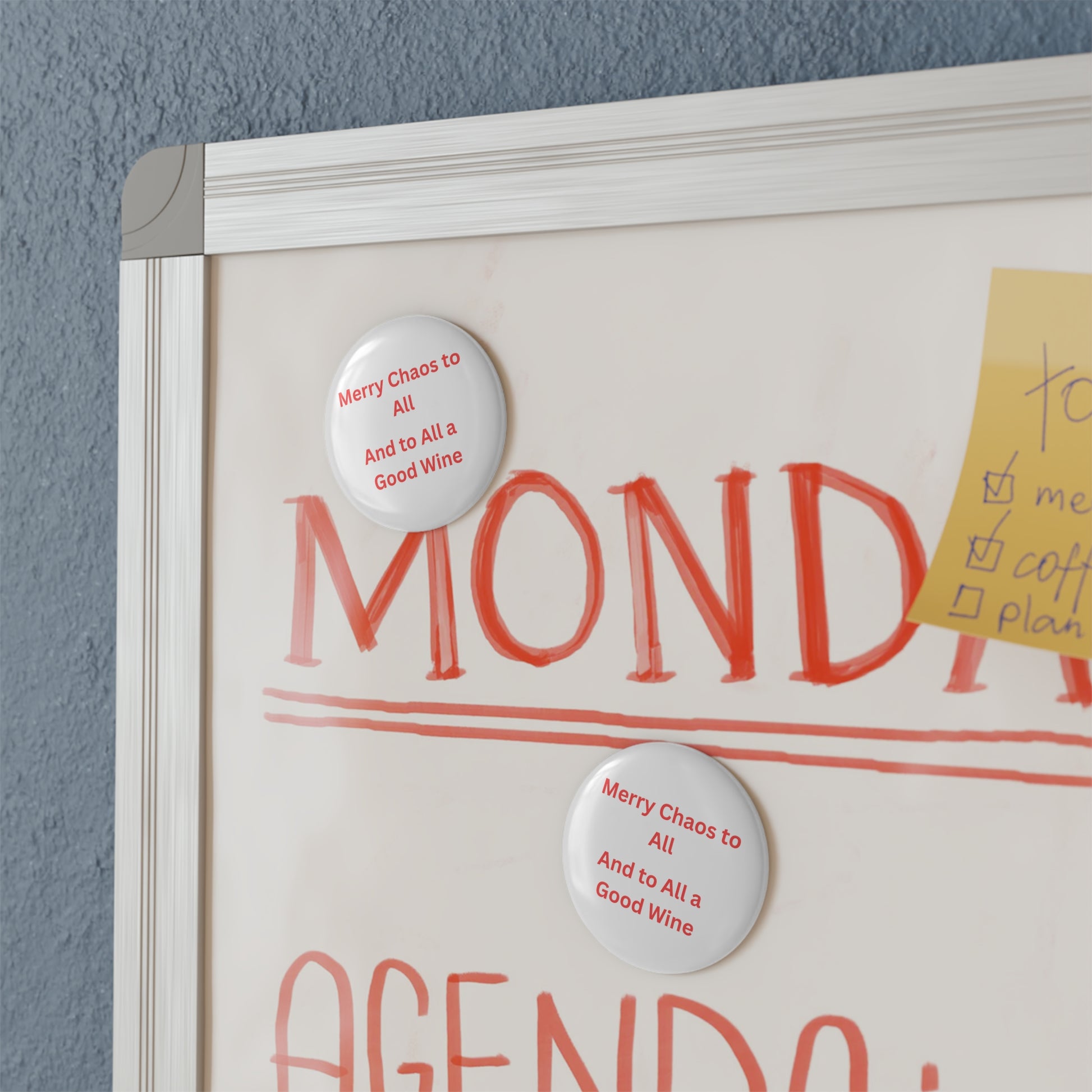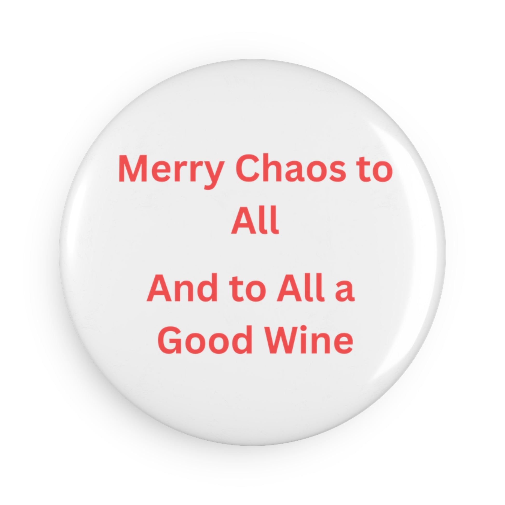 Festive Wine-Themed Button Magnet, Merry Chaos to All, Great for Holiday Decor, Party Favors, Wine Lovers Gift, Christmas Decoration